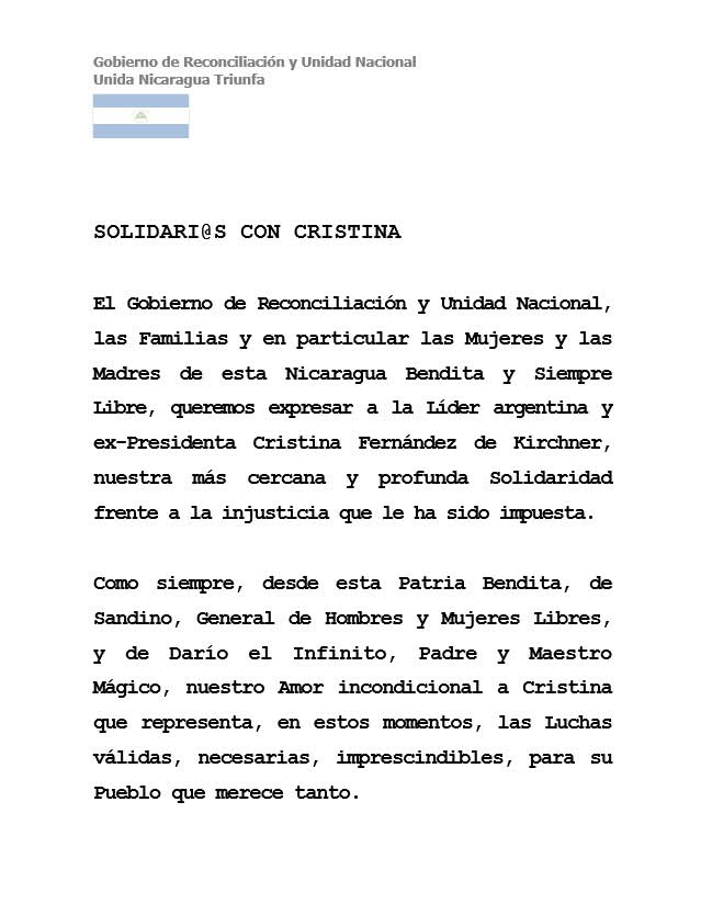 «Queremos expresar a la Líder argentina y ex-Presidenta Cristina Fernández de Kirchner nuestra más cercana y profunda Solidaridad frente a la injusticia que le ha sido impuesta», señala el comunicado firmado por los máximos dirigentes sandinistas. El texto también resalta la conexión histórica de lucha entre los pueblos, evocando a Sandino, a Darío y a las mujeres nicaragüenses que encarnan la resistencia contra todo tipo de opresión.