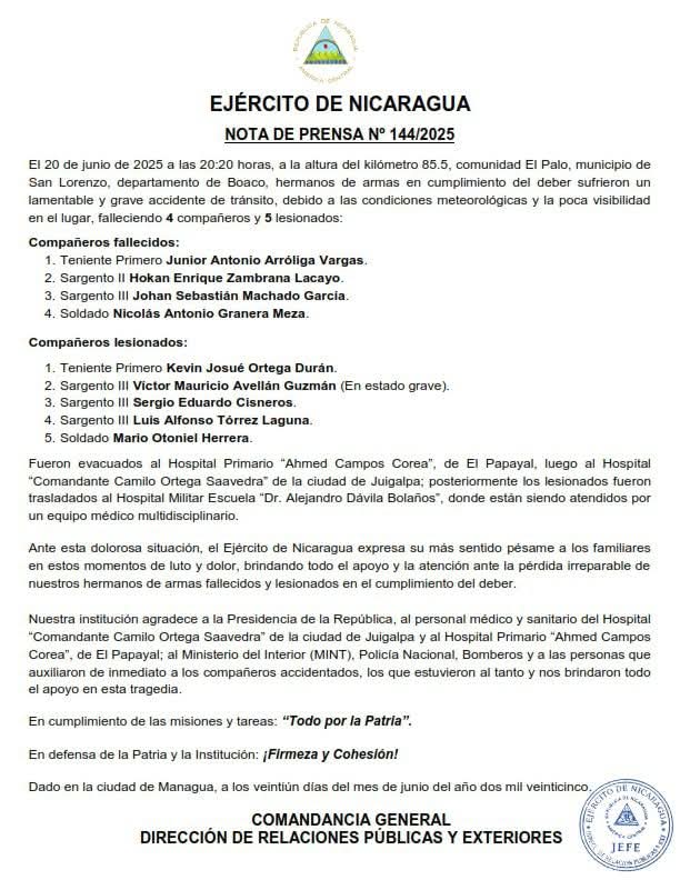 El Ejército de Nicaragua ha confirmado, con profundo pesar, el fallecimiento de cuatro hermanos de armas y cinco más heridos tras un trágico accidente de tránsito ocurrido la noche del 20 de junio, aproximadamente a las 20:20 horas, en el kilómetro 85.5, comunidad El Palo, municipio de San Lorenzo, departamento de Boaco.