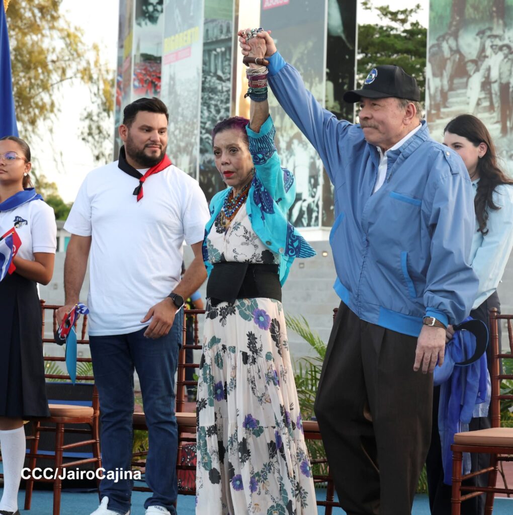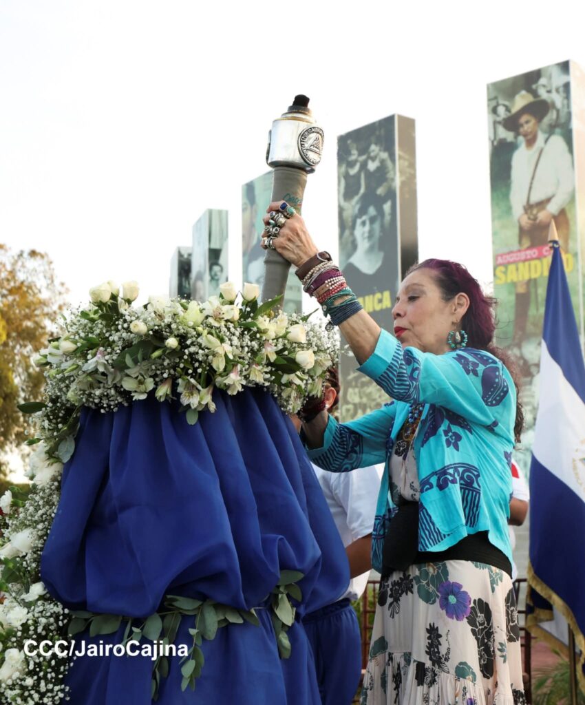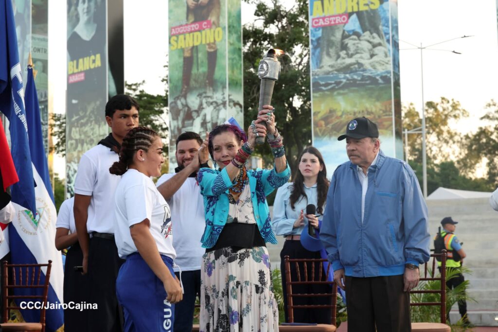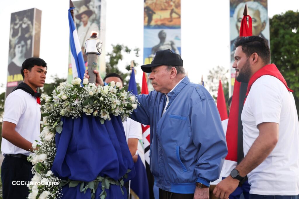 Más adelante, el Comandante Daniel Ortega recibió la antorcha de manos del estudiante Axel Ariel Pravia Mayorga, acompañado de jóvenes campeones mundiales de artes marciales mixtas y atletas que alzaron con dignidad los símbolos patrios.