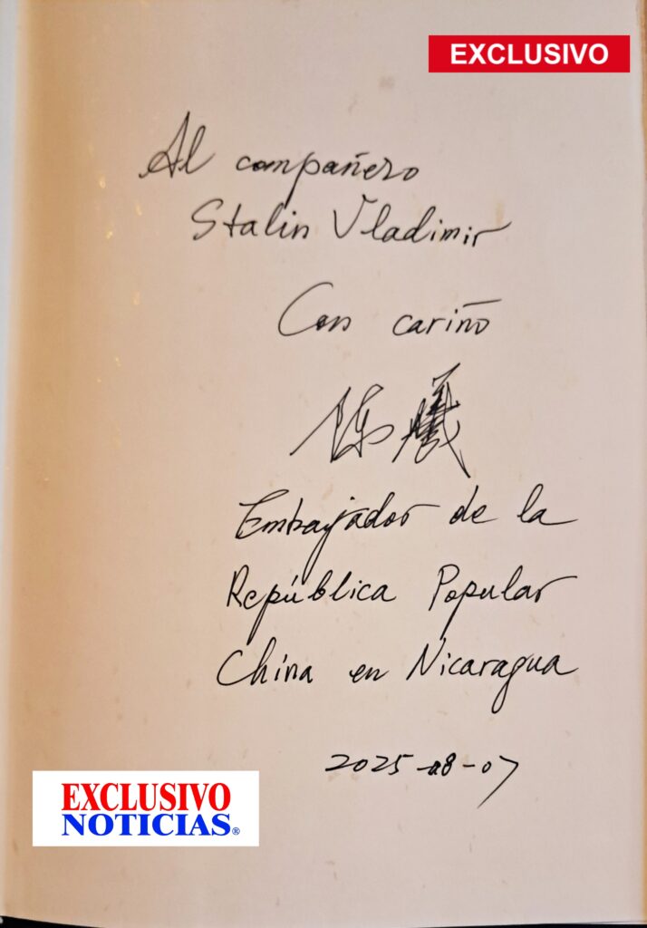 El embajador tuvo la cortesía de obsequiarme cuatro tomos del presidente Xi Jinping, y autografió de puño y letra uno de ellos con la dedicatoria: «Al compañero Stalin Vladimir, con cariño», firmada por él como Embajador de la República Popular China en Nicaragua, con fecha 7 de agosto de 2025. Un gesto que atesoro no solo por el valor material de la obra, sino por el significado personal y diplomático que encierra.