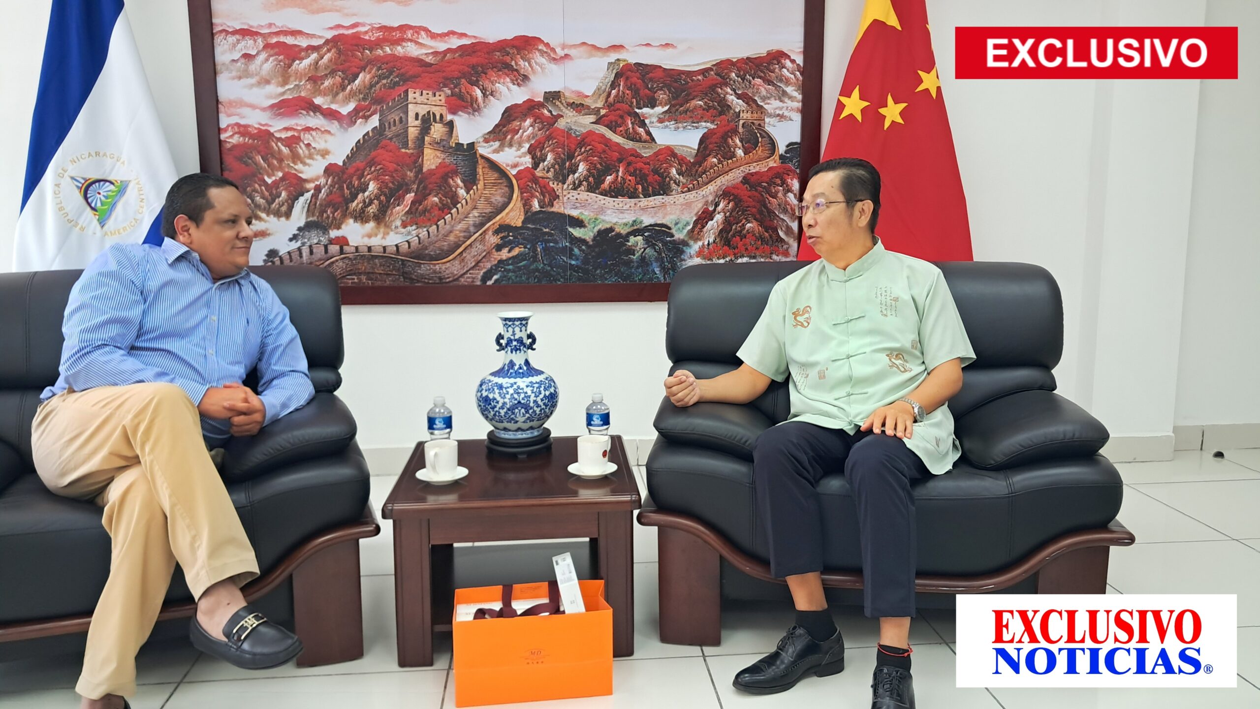 La reunión tuvo lugar en una oficina elegante y sobria, presidida en el fondo por un cuadro de la Gran Muralla China. A un lado, la bandera de Nicaragua acompañaba mi asiento de tonos oscuros; al otro lado, junto al embajador, se erguía la bandera de China. Una mesita al centro sostenía las tazas de té que compartimos, en un ambiente sereno, de diálogo abierto y sincero.