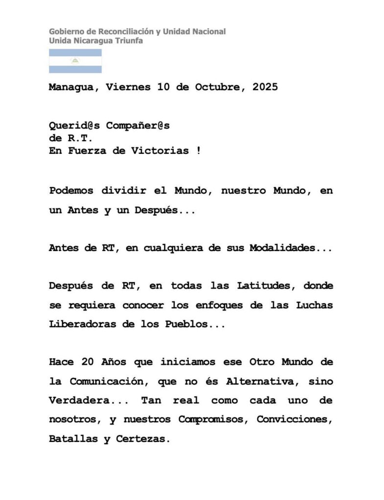 Mensaje a l@s Compañer@s del Canal de Noticias RT, en Fuerza de Victorias, a 20 años de iniciar este Otro Mundo de la Comunicación Verdadera.